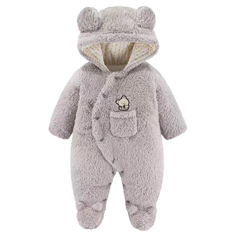 This ultra-soft hooded onesie is designed to keep your baby warm and comfortable during cooler days. Made from plush, high-pile fabric, it offers a cozy feel while remaining gentle on delicate skin. The hood features cute bear-ear details for added warmth and coverage, while the snap-button closure allows for easy dressing and diaper changes.