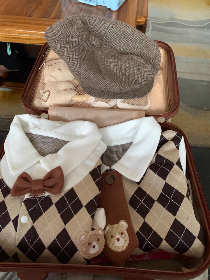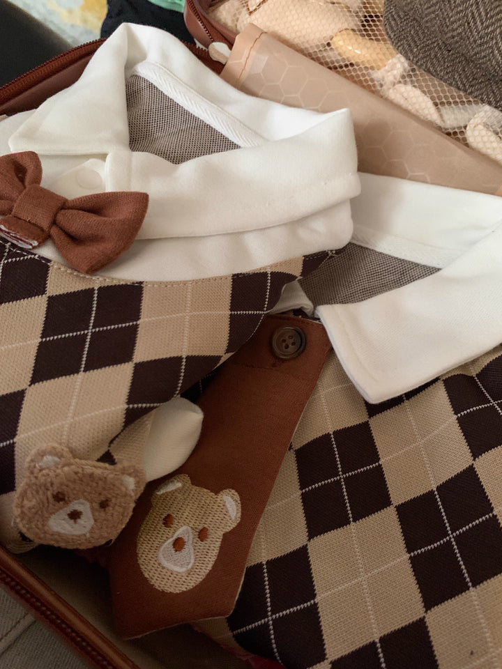 A carefully coordinated selection of baby clothing and accessories, brought together in warm tones and classic patterns. Every detail is chosen to create a balanced, charming look that feels complete, refined, and ready to gift.
